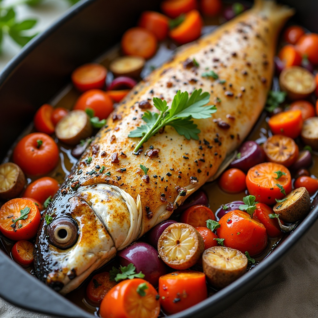 Esta receta utiliza pescado de río, que es generalmente bajo en grasas saturadas y rico en proteínas. Las verduras al horno son bajas en calorías y aportan fibra y vitaminas esenciales. Es importante asegurarse de que la trucha esté bien cocida para matar cualquier bacteria potencialmente peligrosa.