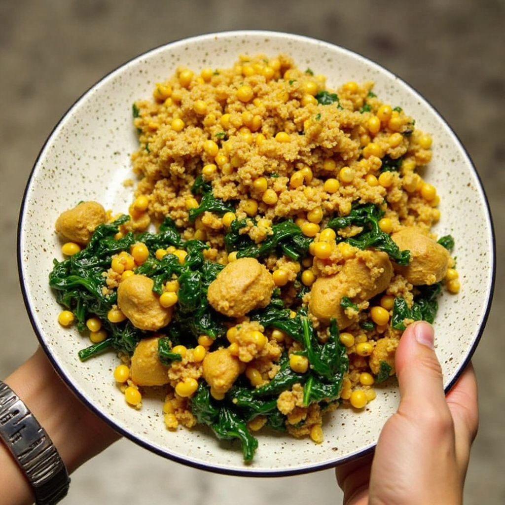 Ugali es un acompañamiento tradicional en muchos países africanos, especialmente en Ruanda. Este plato, que se prepara con maíz o harina de maíz, suele ser seco y firme. En Rwamagana, una región rural de Ruanda conocida por su cocina vibrante, hemos adaptado un clásico con espinacas frescas y pollo al curry para ofrecer un toque exótico pero acogedor a este básico. Este plato es ideal para quienes buscan una comida reconfortante y llena de sabor.