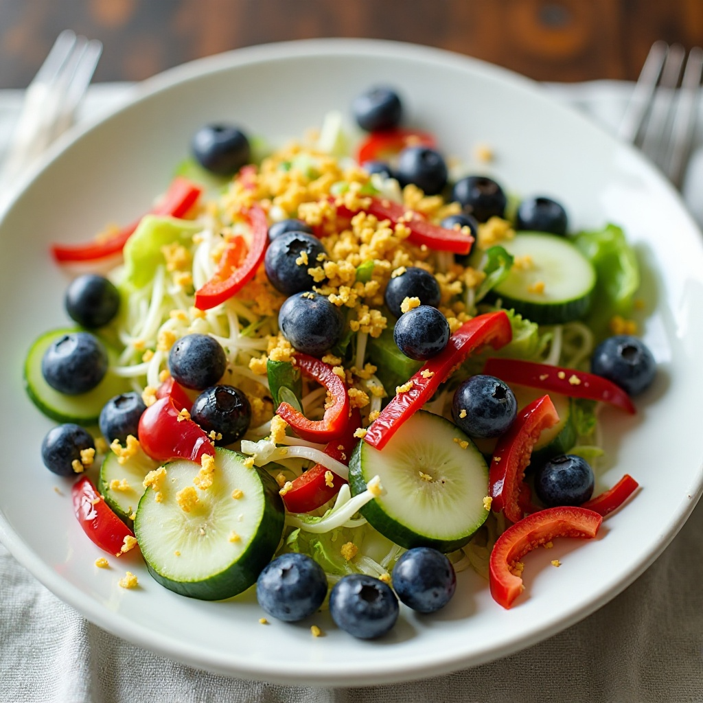 - En otro bol, mezcla el pepino, los arándanos, el pimiento rojo y la cebolleta verde. Salpimienta ligeramente.