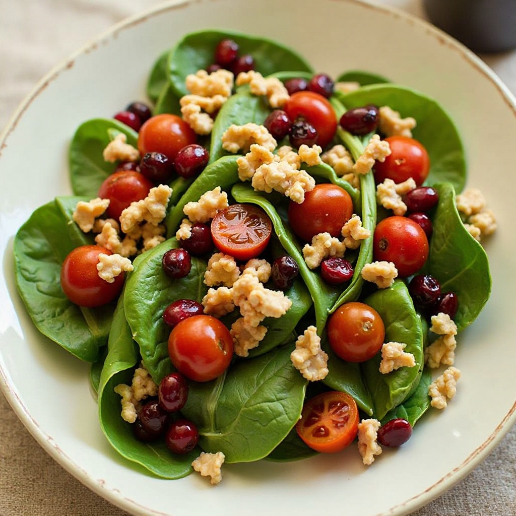 2. En un tazón grande, mezcla las espinacas, los tomates cherry, los arándanos rojos y las nueces picadas.