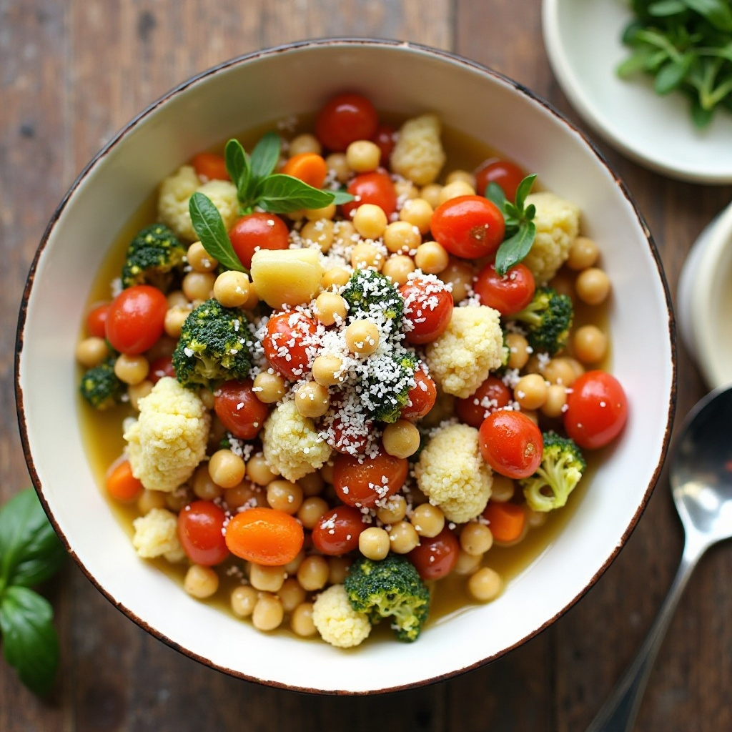 Este plato es una excelente fuente de fibra, gracias a las verduras y los garbanzos. La albahaca aporta antioxidantes, mientras que el aceite de oliva contribuye a la salud cardiovascular. Si deseas una versión más ligera, puedes reducir la cantidad de queso parmesano o usar parmesano light.