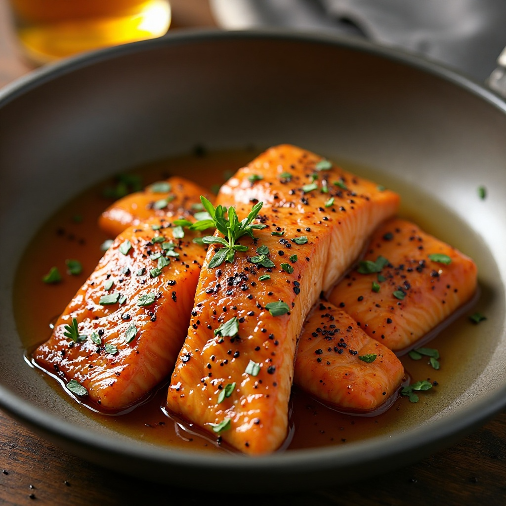 2. Sazona los filetes de salmón con sal y pimienta. Coloca los filetes en la sartén, dejando que el Whisky Maple glaze cubra los lados de los filetes.