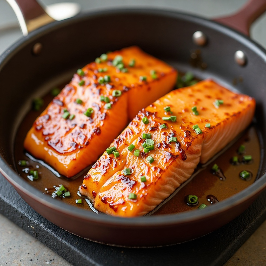- Cocina cubriendo el sartén con una tapa durante unos 5 minutos, o hasta que el salmon esté cocido a tu gusto (aproximadamente 3-4 minutos más). Si es necesario, puedes añadir un poco más de líquido del maple syrup para mantener la humedad.