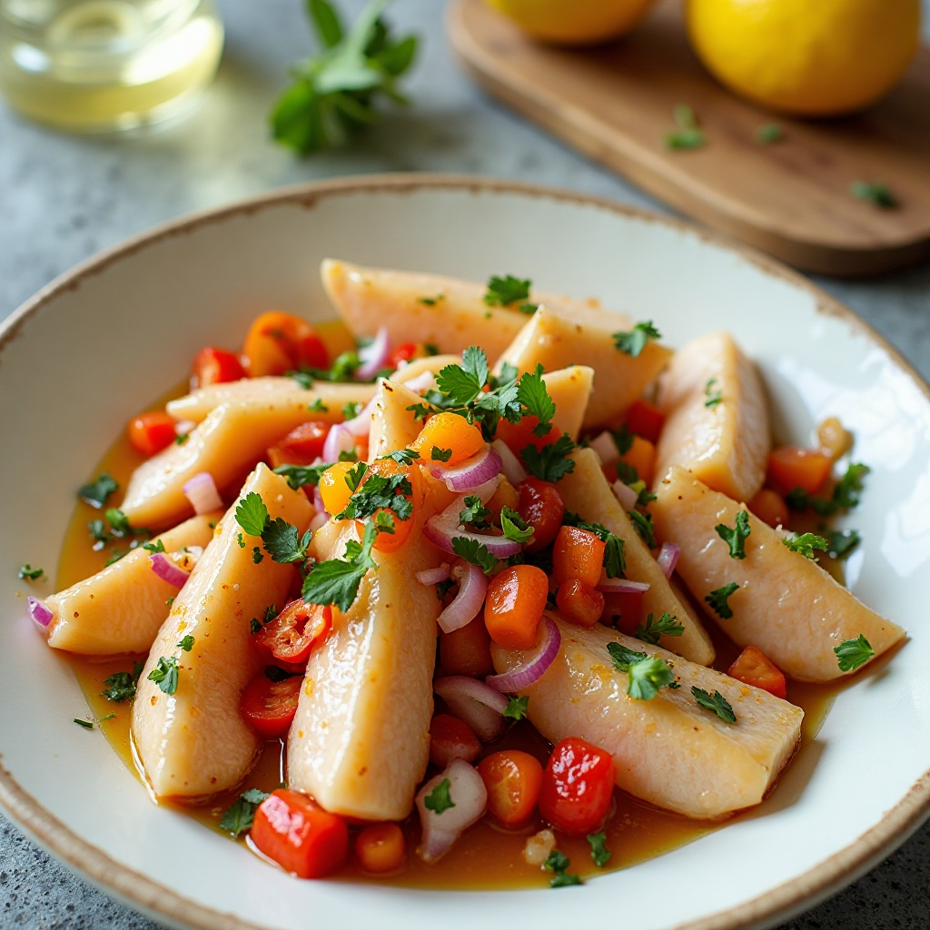 El ceviche es un plato saludable por su contenido de proteínas y nutrientes esenciales presentes en el pescado. El vino blanco utilizado aquí puede tener propiedades antioxidantes, aunque siempre se debe beber con moderación debido a sus efectos alcohólicos. Asegúrate de que los filetes de trucha estén bien refrigerados antes de preparar el plato.