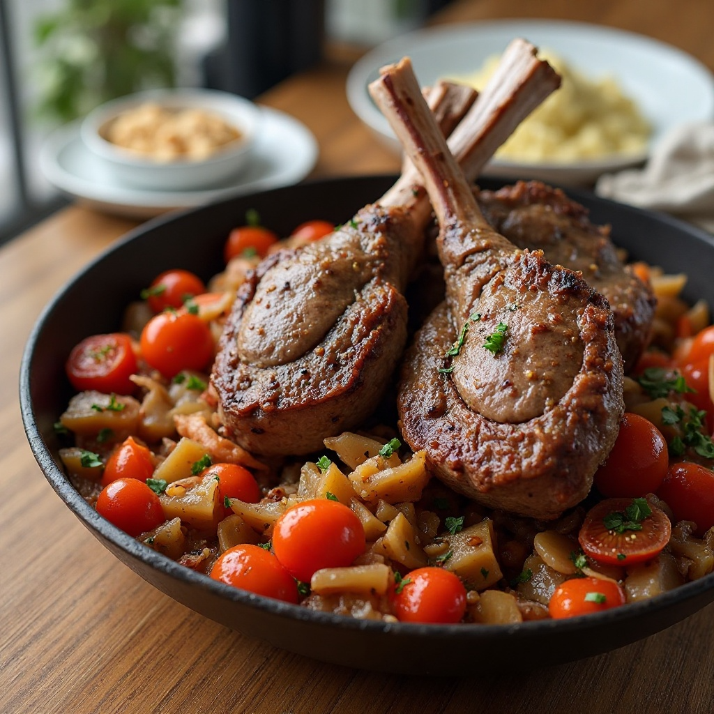 5. Sirve el cordero con las verduras a la parrilla, distribuyendo las rodajas de cebolla y tomate en el plato. Puedes acompañarlo con papas hervidas o arroz blanco para una cena completa.