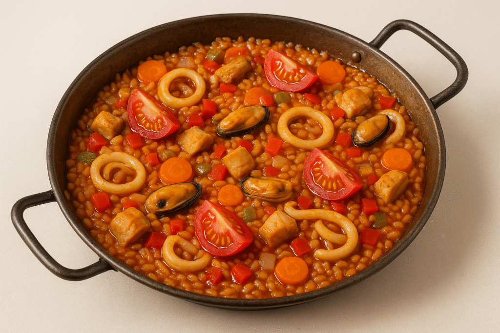 La paella es un plato emblemático de España, originario de Valencia, pero su versatilidad permite adaptaciones regionales. La versión empordanesa destaca por el uso de ingredientes locales y un vino Empordà, que le da un toque distintivo a este plato. Esta receta es ideal para compartir en una comida familiar o evento festivo.