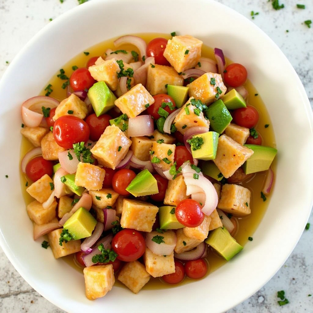 - Añade el jugo de limón y mezcla con los vegetales. Incorpora el aguacate a la mezcla, asegurándote de que esté completamente cubierto por el jugo y los líquidos de marinada.