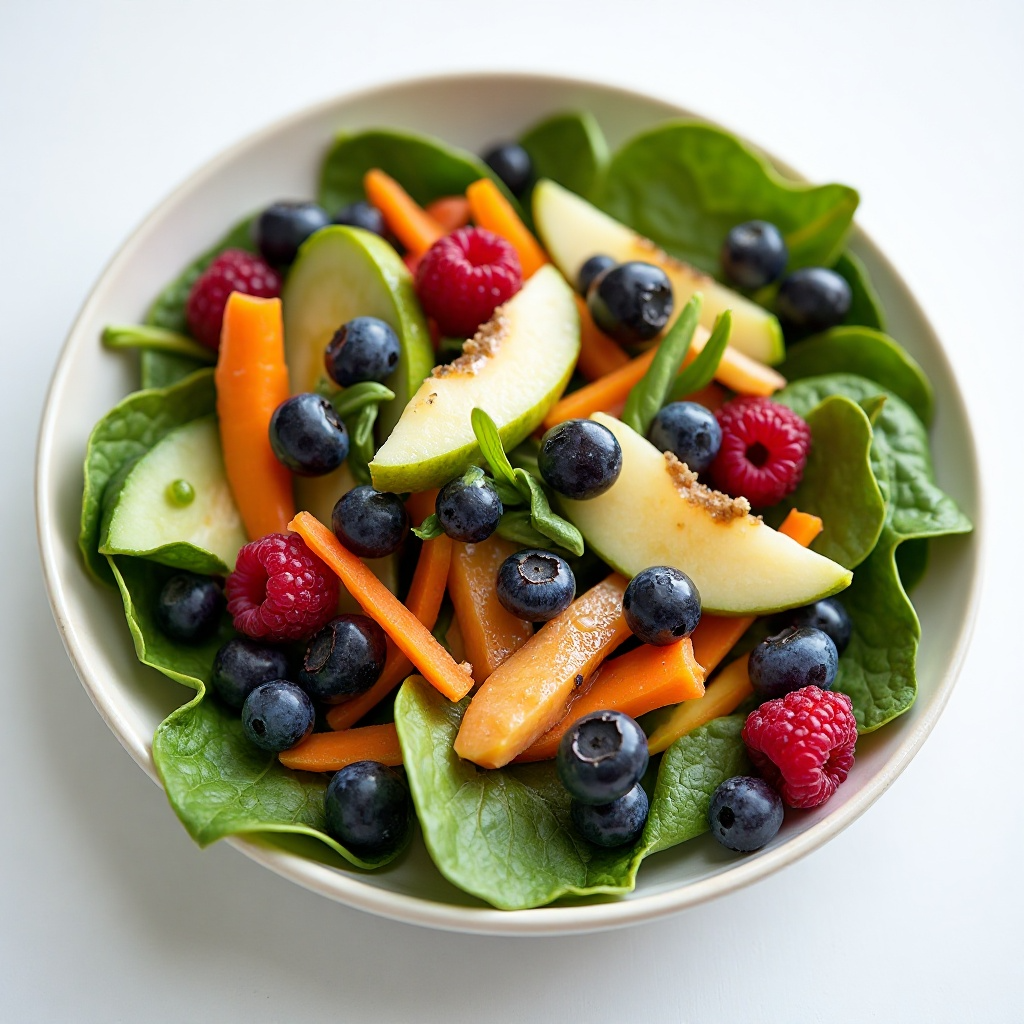 2. En un tazón grande, mezcla las zanahorias, el pepino y los arándanos. Agrega las frambuesas y las manzanas, asegurándote de que todos los ingredientes estén bien combinados.
